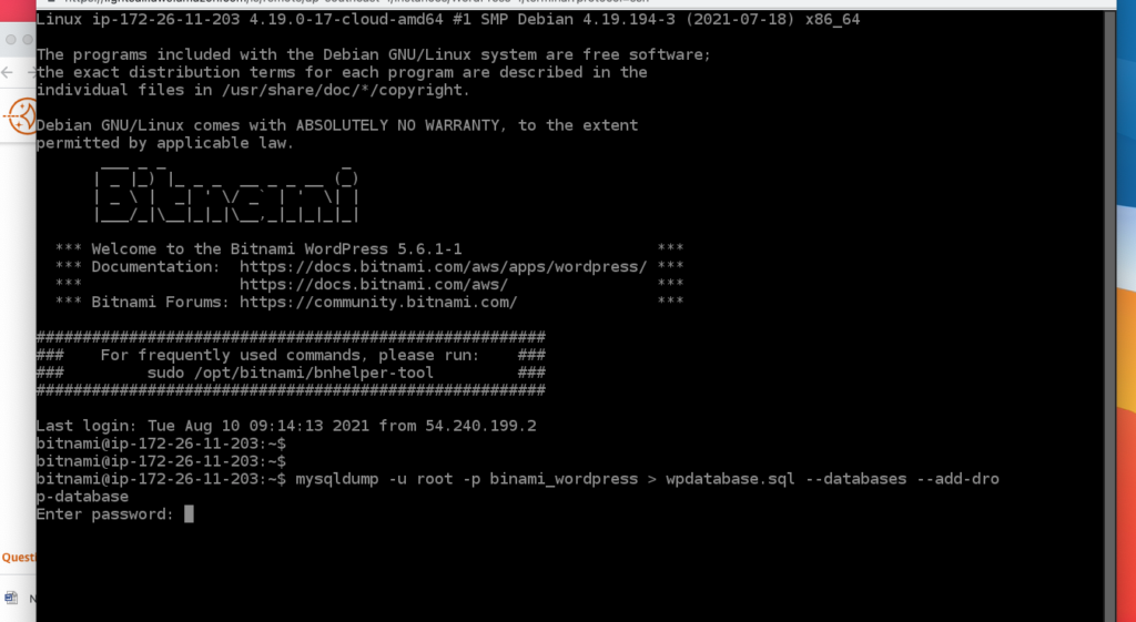 - mysqldump -u root -p binami_wordpress > wpdatabase.sql –databases –add-drop-database